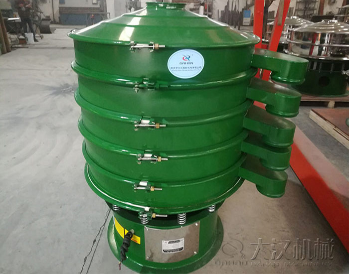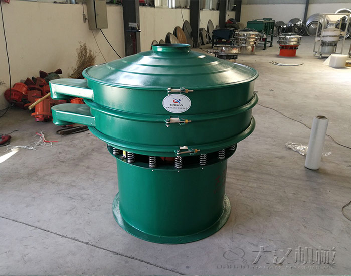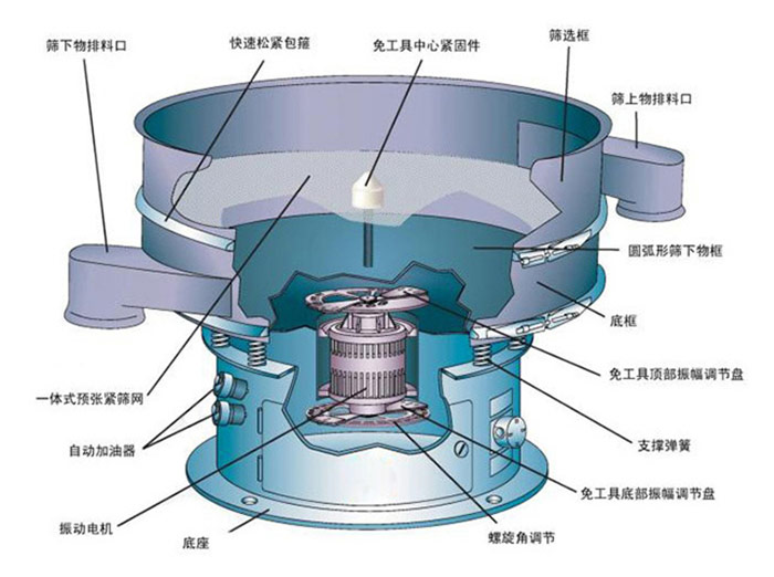 三次元震動篩主要由進料口、防塵蓋、出料口、束環、篩網、配重塊、上部重錘、振動體、振動電機、彈簧、下部重錘、機座等部分組成。三次元震動篩采用了直立式電機作激振源,在電機的上、下兩端安裝有偏心重錘,將電機的旋轉運動變為垂直、水平、傾斜的三次元運動,再把這個運動傳遞給篩面,帶動篩面振動,物料粒度小于篩網孔徑的落到篩網下層,粒度大于篩網孔徑的則留在篩面上,從而達到篩分的目的。