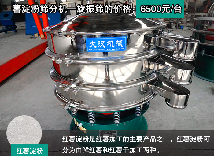 紅薯淀粉是紅薯加工的主要產(chǎn)品之一,紅薯淀粉可分為由鮮紅薯和紅薯干加工兩種。紅薯淀粉其還有減肥的作用,那么紅薯淀粉篩分機(jī)—旋振篩的價格是多少呢?小編為你提供做真實的答案薯淀粉篩分機(jī)—旋振篩的價格:6500元/臺
